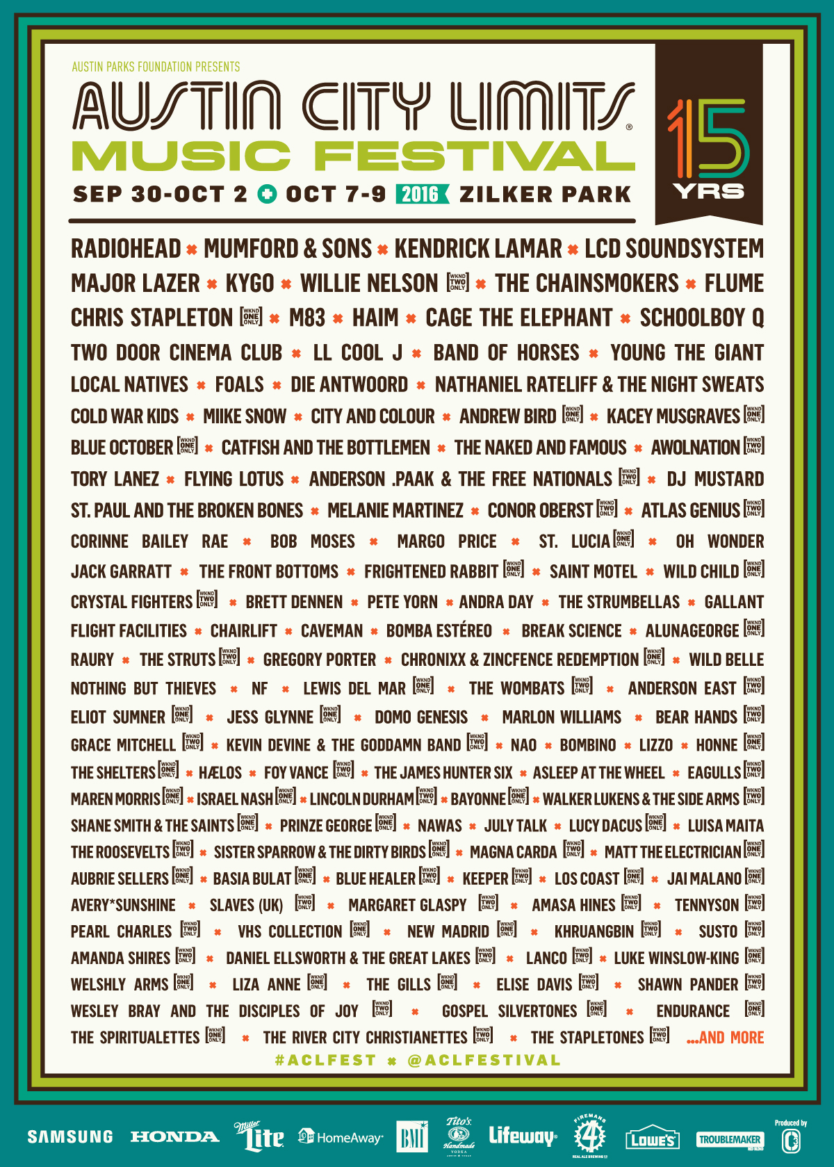 Austin City Limits Music Festival celebra su 15 aniversario y para celebrarlo ha reunido a grandes bandas para este 2016 , entre ellos se destacan : Radiohead y Mumford & Sons harán su aparición por primera vez junto a Kendrick Lamar, LCD Soundsystem, Major Lazer, y KYGO.