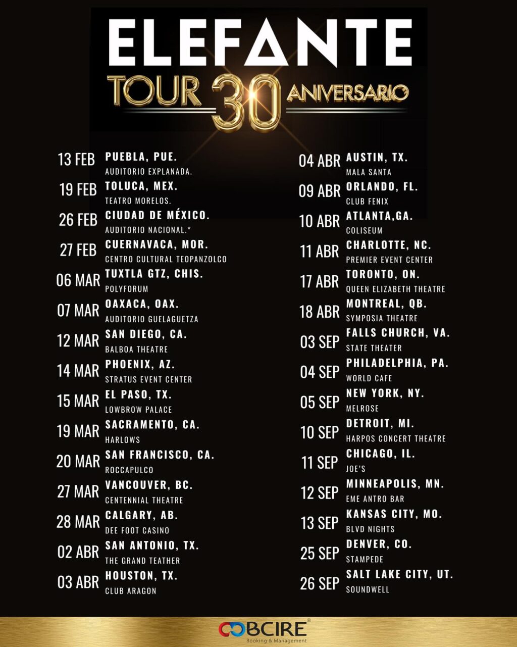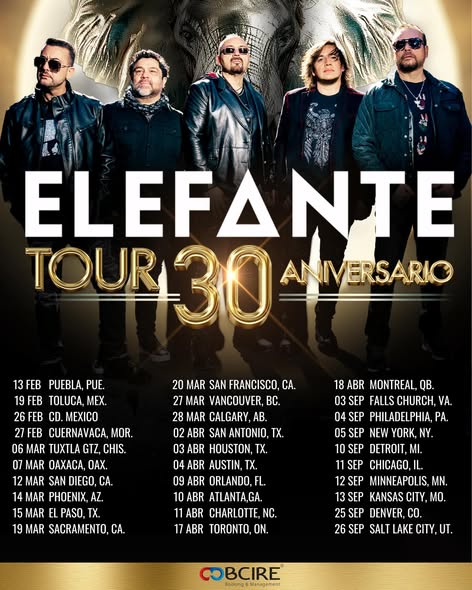 “Elefante Tour 30 Años” representa una de sus giras nacionales e internacionales más prometedoras en la carrera del grupo, con una amplia lista de canciones y presentaciones renovadas. El espectáculo llegará a más de 30 ciudades en EE.UU., incluyendo San Diego, New York, Miami, Chicago, Atlanta, Las Vegas, San Francisco y Los Ángeles, entre otras. Las entradas para la gira de EE. UU. se pueden ya adquirir a través de esta BOLETOS