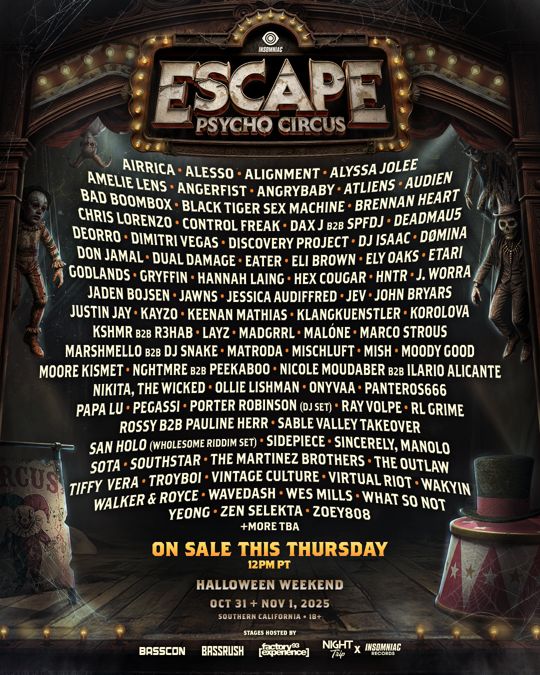 Insomniac ha revelado el cartel de Escape Psycho Circus 2025, que regresa al Centro de Eventos NOS el 31 de octubre y el 1 de noviembre.