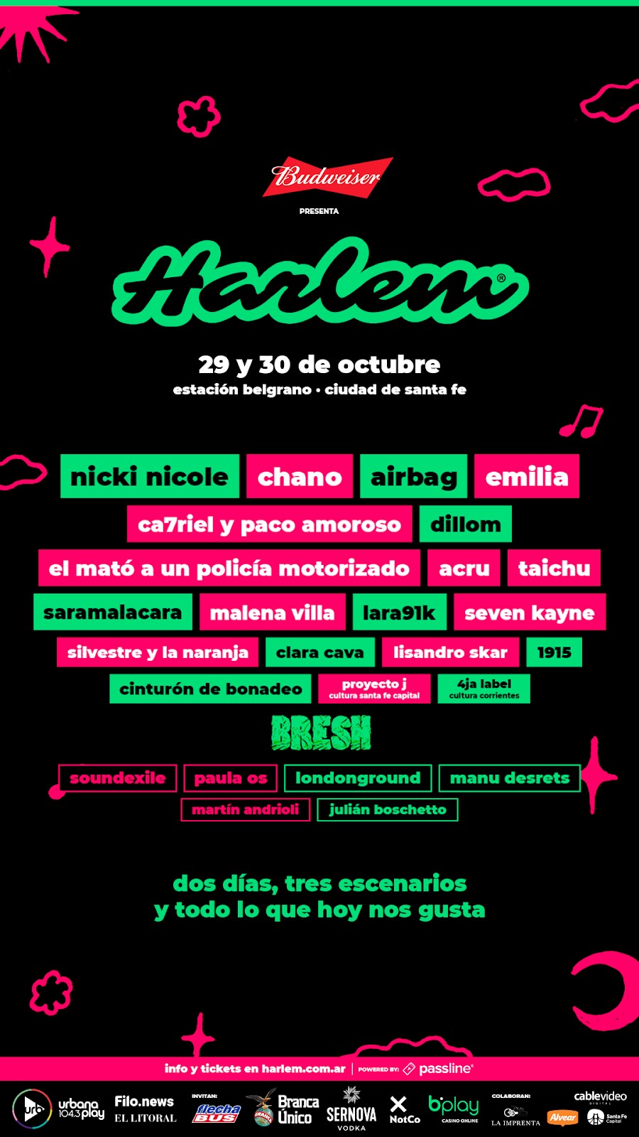 Hoy terminamos de conocer el mega line up que propone Harlem Festival en esta edición, una grilla pensada y creada para reunir a todas las edades de la última generación, Nicki Nicole una de las artistas Argentinas con mayor proyección internacional, Chano, el ex líder de Tan Bionica regresa a la ciudad tras 8 años de su última visita, el trío de los hermanos Sardelli aportando su cuota de rock pop debutan en el festival al igual que El Mato un Policia Motorizado. El creador del exitosísimo Post Mortem, uno de los mejores discos del último tiempo, Dillom debutará en el escenario principal al igual que Emilia Mernes.