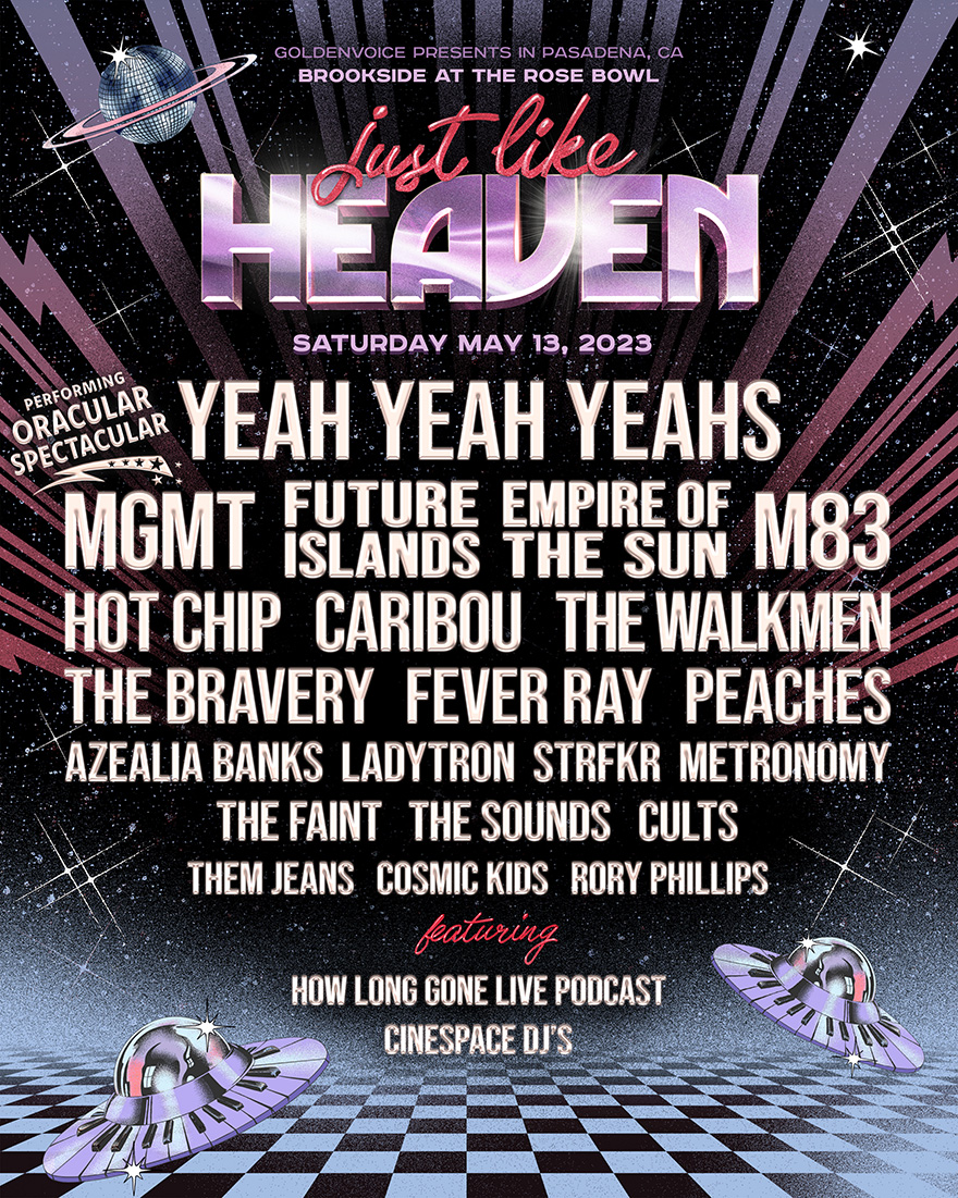 Just Like Heaven Festival2023 contará con la participación de grandes artistas y actos sorpresa como MGMT, Yeah Yeah Yeahs ,Hot Chip, Two Door Cinema Club, Caribou, Fever Ray, Bravery, Peaches, Azealia Banks  Ladytron, STRFKR,  The Faint, the Sounds y Cults.